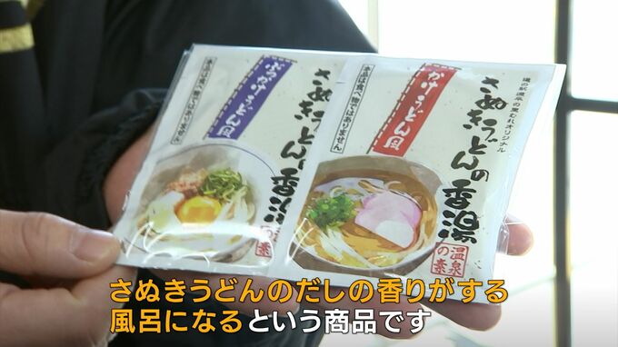 「こちらの商品です。湯に溶かしてもらうと、温泉の素としてさぬきうどんのだしの香りがする風呂になるという商品です」