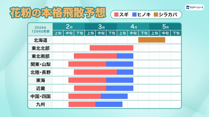 2月上旬に東海や関東、九州北部でスギ花粉の飛散が始まり、3月上旬にかけて全国で飛散が始まります。本格的な飛散は