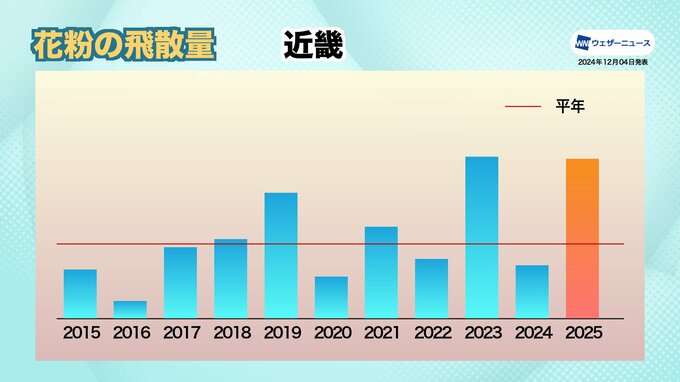 このため、2025年は前年の反動で飛散量が多くなる「表年」になると見込み、2025年春の飛散量は前年の302%、平年の213%となる予想です。