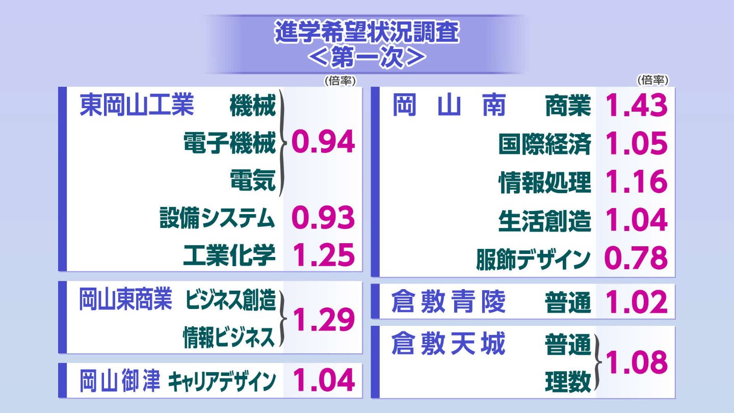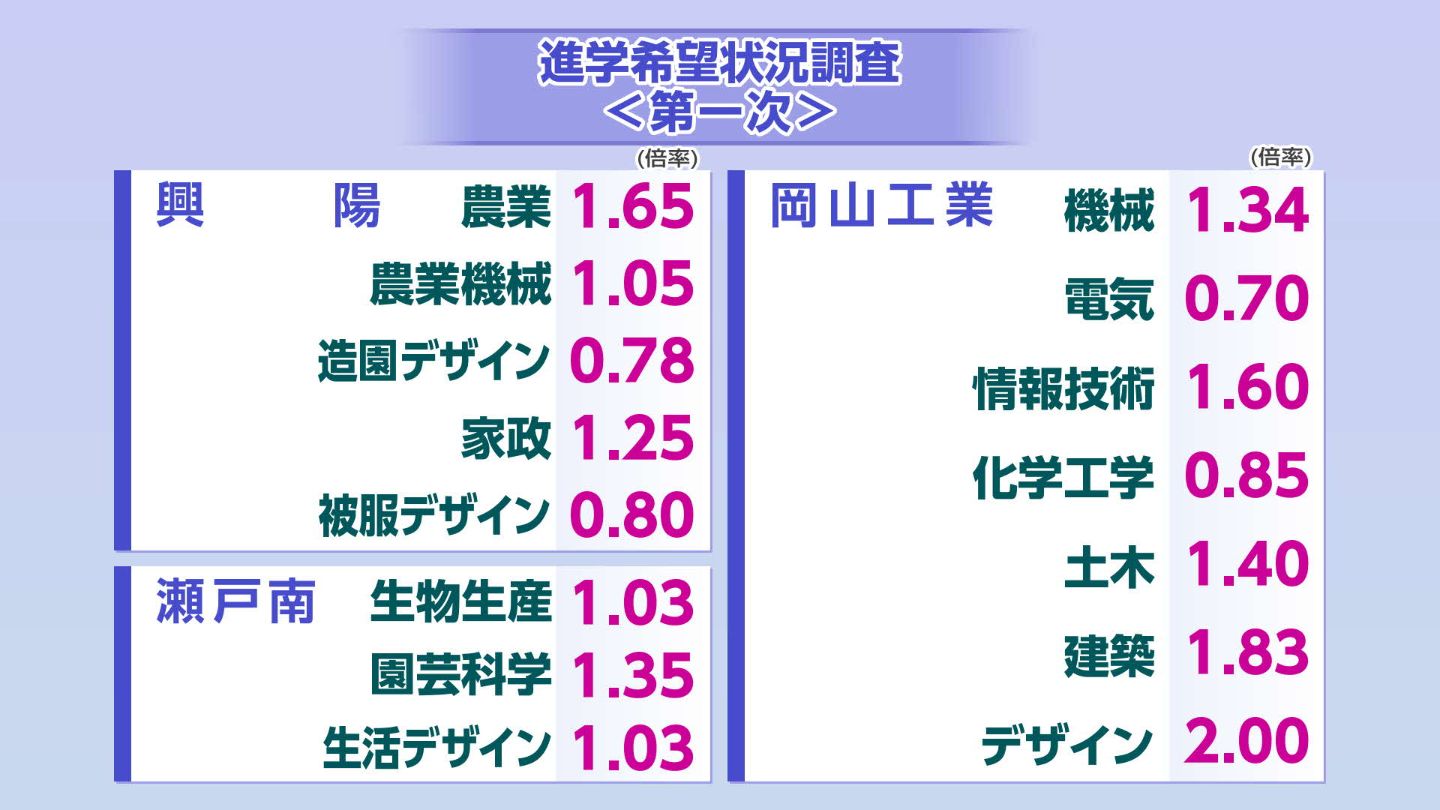 このうち倍率が最も高かったのは、岡山工業(デザイン)の2.00倍で、次いで倉敷工業(機械)の1.95倍、倉敷中央(家政)の1.93倍、岡山工業(建築)1.83倍、西大寺(普通・国際情報)の1.69倍、興陽(農業)の1.65倍です。