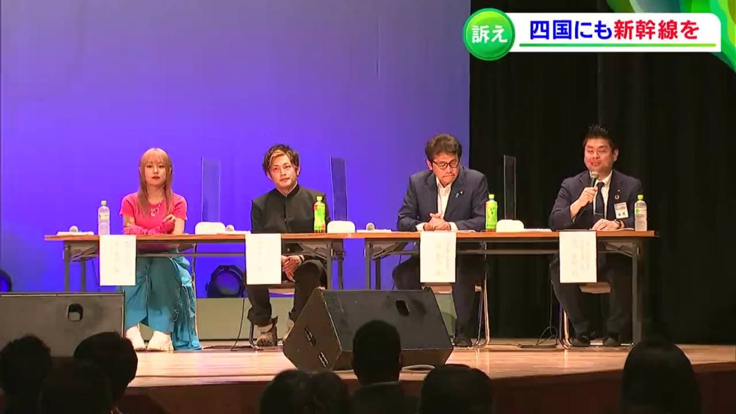 日本青年会議所四国地区協議会が、新幹線が通ることを前提として作られた瀬戸大橋のたもと、坂出市で開いたものです。若い世代にも四国新幹線の創設に関心を持ってもらいたい、とパネルディスカッションが開かれました。