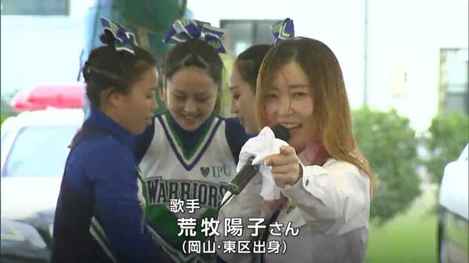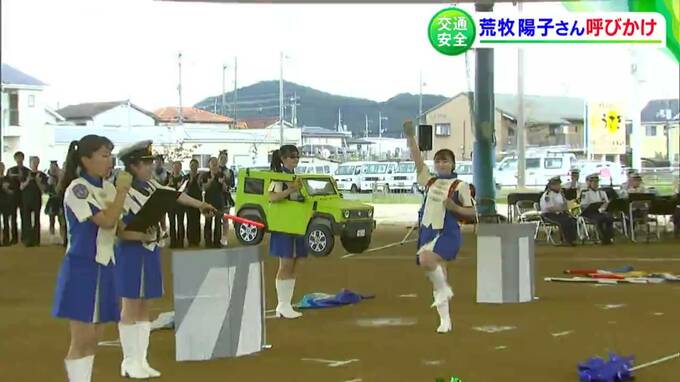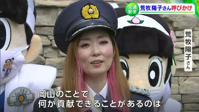 交通事故による死亡者数が増加する中、改めて交通安全を呼びかけようと、歌手で岡山市出身の荒牧陽子さんが交通安全市民運動広報大使に就任し、安全運転などを呼びかけました。