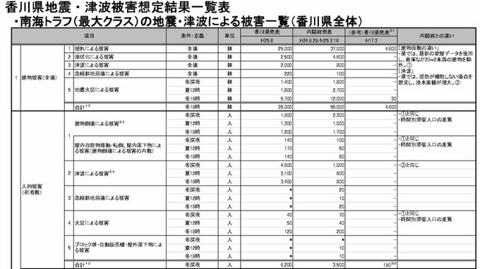 「南海トラフ地震臨時情報」が発表されたらどうすればいい? 巨大地震警戒、巨大地震注意、調査終了とは… “調査終了”は大規模地震の発生の可能性がゼロではない 2025年1月17日(金) 20:00 岡山 岡山・香川の被害想定は? 岡山県によりますと、震度6強を想定した場合の被害想定は【画像⑥】のとおりです。 【画像⑥】岡山県ホームページより また、香川県によりますと、震度7を想定した場合の被害想定は【画像⑦⑧】のとおりです。 【画像⑦】香川県ホームページより 【画像⑧】香川県ホームページより