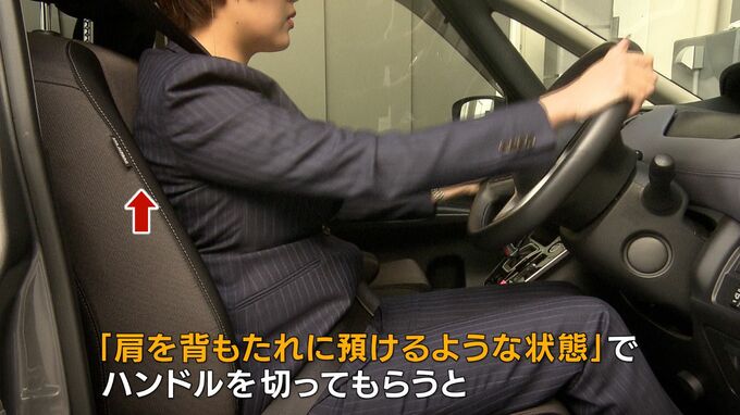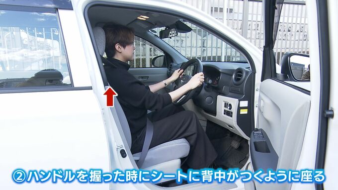 「肩を背もたれに預けるような状態でハンドルを切ってもらうと【画像③】、姿勢が安定しませんか?」