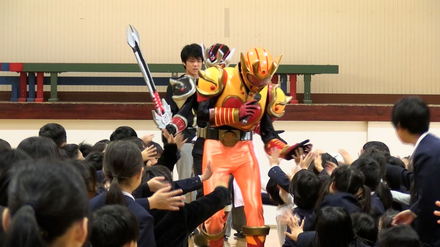子どもたちを熱狂させるミマダインショー。ライバルのネガダイン率いる悪の軍団との戦いを通じて、給食を残さず食べることの大切さを子どもたちに伝えました。