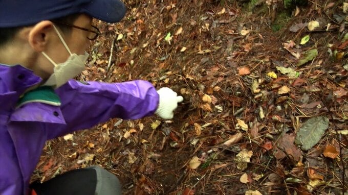 岡山市の服部興業が所有しているマツタケ山です。収穫されたマツタケは全国に販売されています。この道20年のベテラン川原洋平さん。落ち葉に埋もれたマツタケもあっという間に見つけ出します。