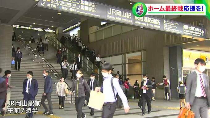 ファジアーノ岡山のスタッフらが、通勤・通学時間帯のJR岡山駅前に立ち、ホーム最終戦を知らせるチラシを配りました。