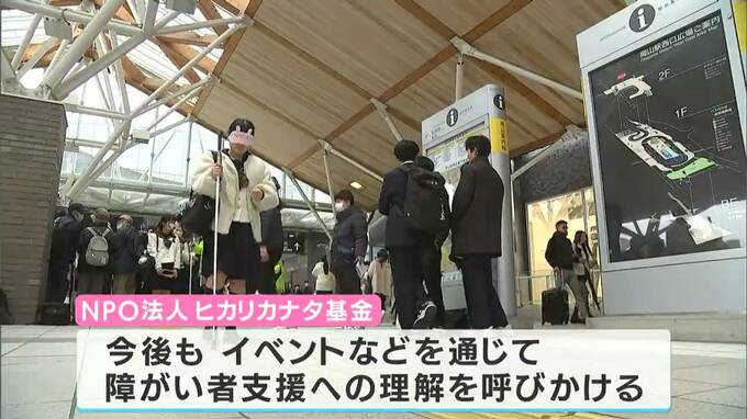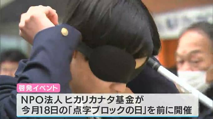 今年で、制定15周年となる「点字ブロックの日」を前に岡山市のNPO法人“ヒカリカナタ基金”が企画したもので、学生や一般の参加者約20人が、アイマスクを装着し点字ブロックの上を歩きました。