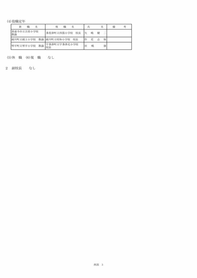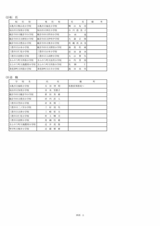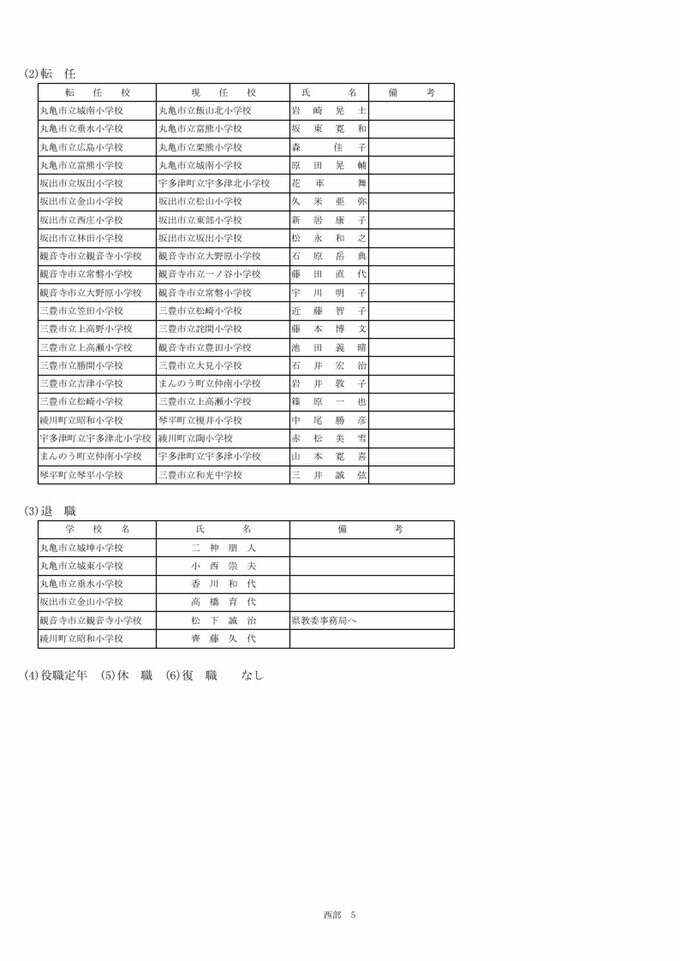 香川県 教職員人事異動2025「あの先生、どこ行ったんかいのぅ」名簿一覧掲載【香川県西部 公立小中学校】 2025年3月21日(金) 13:00 香川 西部(丸亀市・坂出市・善通寺市・観音寺市・三豊市・綾歌郡・仲多度郡)公立小学校 校長・副校長・教頭等 西部の公立小学校の校長・副校長・教頭は【画像1~5】の通りです。 【画像1】 【画像2】 【画像3】 【画像4】 【画像5】