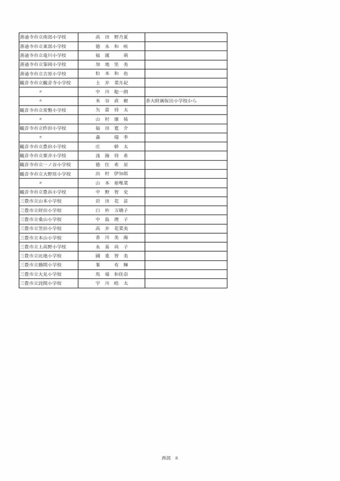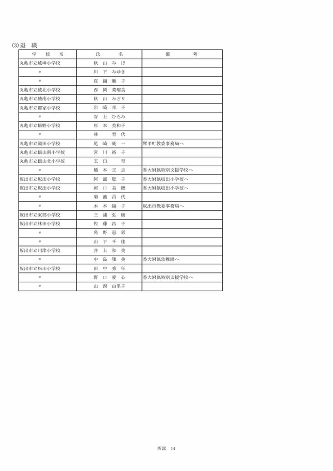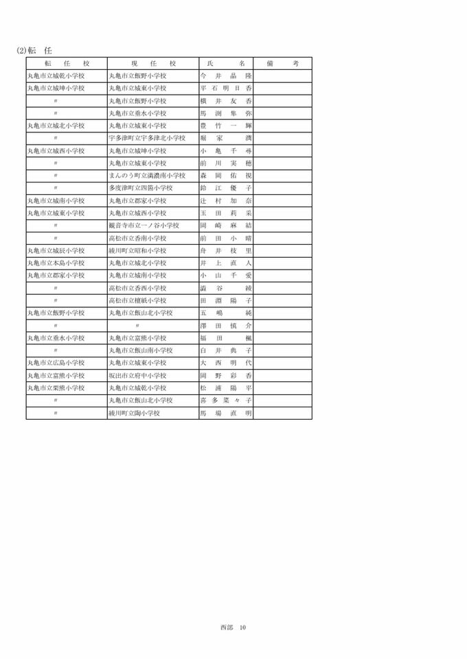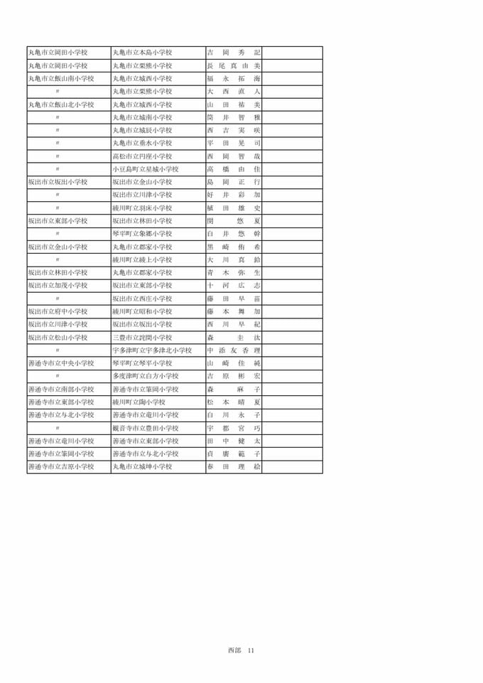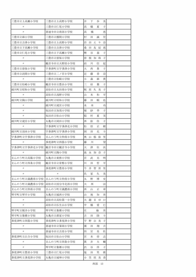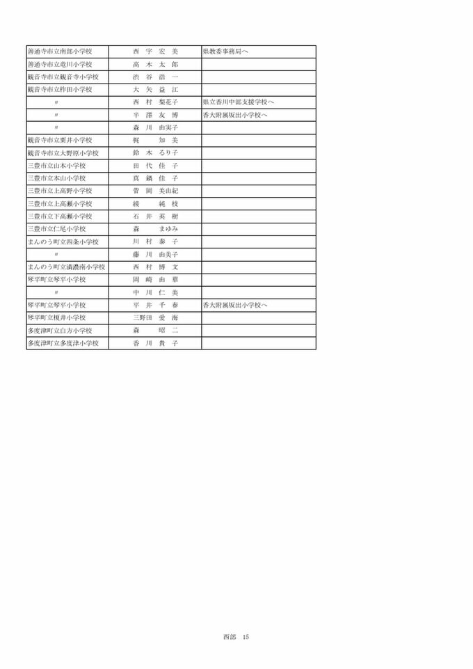 香川県 教職員人事異動2025「あの先生、どこ行ったんかいのぅ」名簿一覧掲載【香川県西部 公立小中学校】 2025年3月21日(金) 13:00 香川 西部(丸亀市・坂出市・善通寺市・観音寺市・三豊市・綾歌郡・仲多度郡)公立小学校 教諭 西部の公立小学校の教諭は【画像6~22】の通りです。 【画像6】 【画像7】 【画像8】 【画像9】 【画像10】 【画像11】 【画像12】 【画像13】 【画像14】 【画像15】 【画像16】 【画像17】 【画像18】 【画像19】 【画像20】 【画像21】 【画像22】