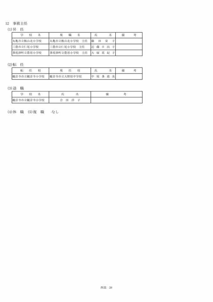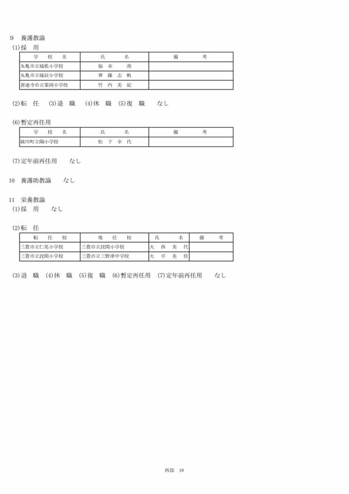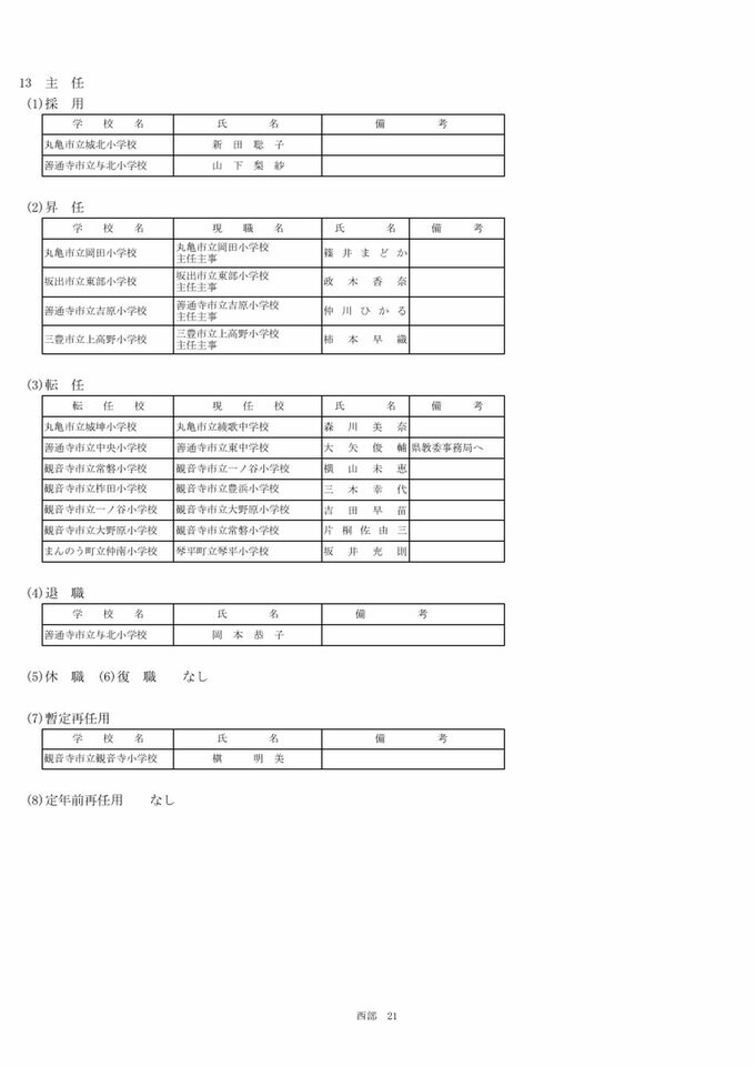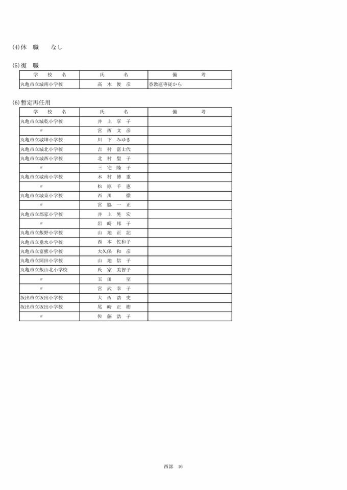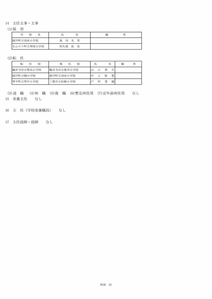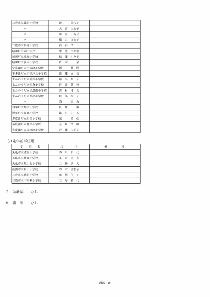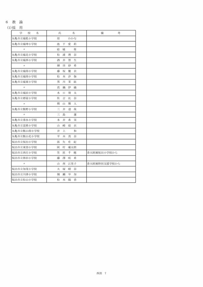 香川県 教職員人事異動2025「あの先生、どこ行ったんかいのぅ」名簿一覧掲載【香川県西部 公立小中学校】 2025年3月21日(金) 13:00 香川 西部(丸亀市・坂出市・善通寺市・観音寺市・三豊市・綾歌郡・仲多度郡)公立小学校 教諭 西部の公立小学校の教諭は【画像6~22】の通りです。 【画像6】 【画像7】 【画像8】 【画像9】 【画像10】 【画像11】 【画像12】 【画像13】 【画像14】 【画像15】 【画像16】 【画像17】 【画像18】 【画像19】 【画像20】 【画像21】 【画像22】