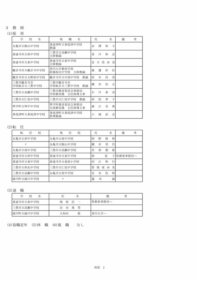 香川県 教職員人事異動2025「あの先生、どこ行ったんかいのぅ」名簿一覧掲載【香川県西部 公立小中学校】 2025年3月21日(金) 13:00 香川 西部(丸亀市・坂出市・善通寺市・観音寺市・三豊市・綾歌郡・仲多度郡)公立中学校 校長・副校長・教頭等 西部の公立中学校の校長・副校長・教頭等は【画像23・24】の通りです。 【画像23】 【画像24】