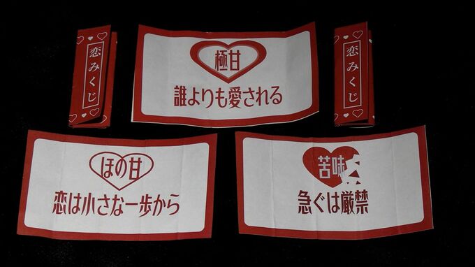 また、プリンについている「恋みくじ」は、手にした人に恋のドキドキを感じてもらおうというものです。運勢は「極甘」「ほの甘」「苦み」の3種類で、それぞれにメッセージがついています。