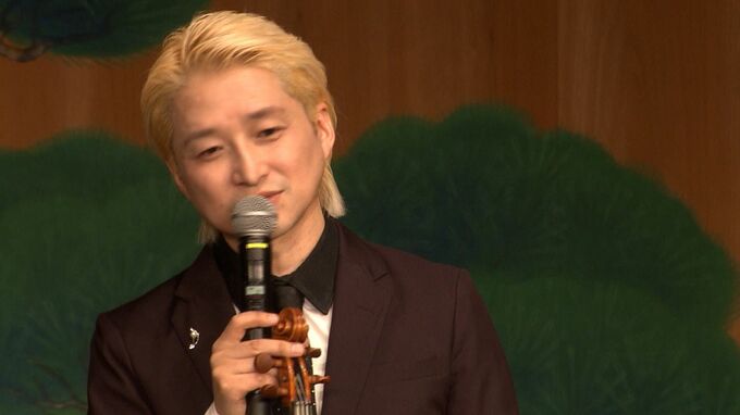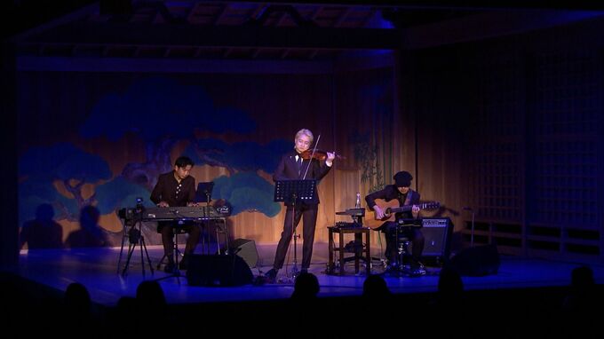 能舞台に、映画をイメージした情感あふれる音色が響きます。NAOTOさんは幅広いジャンルの演奏や作曲を手がけていて、RSKが制作した映画「新居浜ひかり物語青いライオン」の音楽も担当しています。