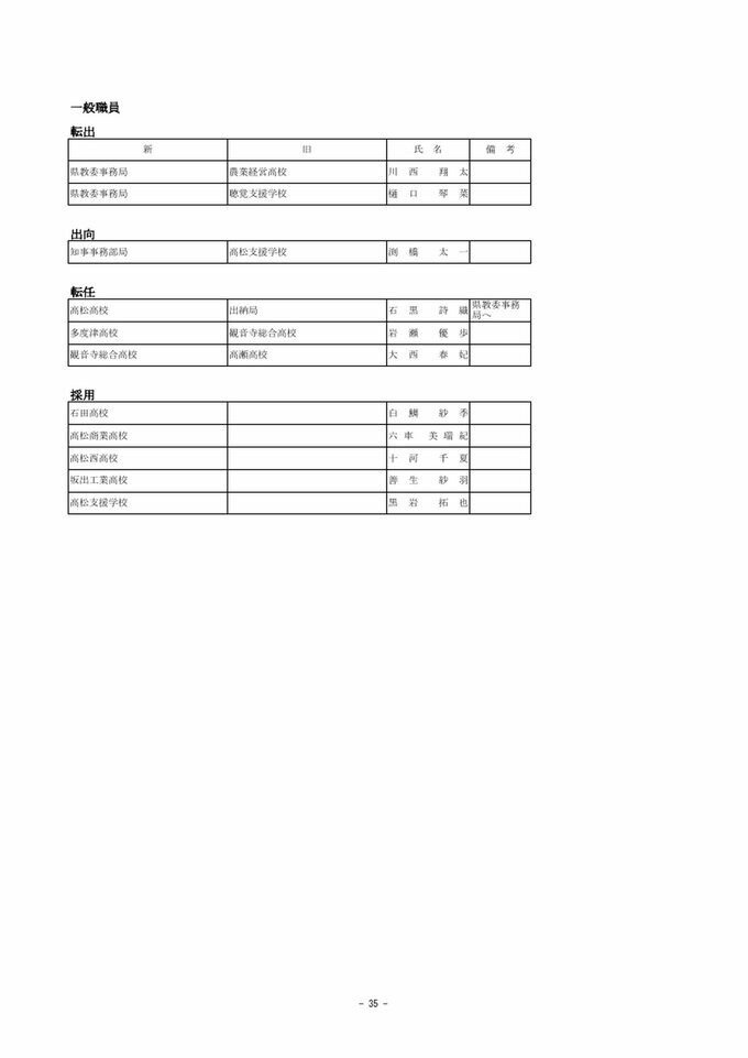 香川県 教職員人事異動2025「あの先生、どこ行ったんかいのぅ」名簿一覧掲載【県立学校教員・事務職員】 2025年3月21日(金) 16:00 香川 事務局職員の異動 事務局職員は【画像30~34】の通りです。 【画像30】 【画像31】 【画像32】 【画像33】 【画像34】