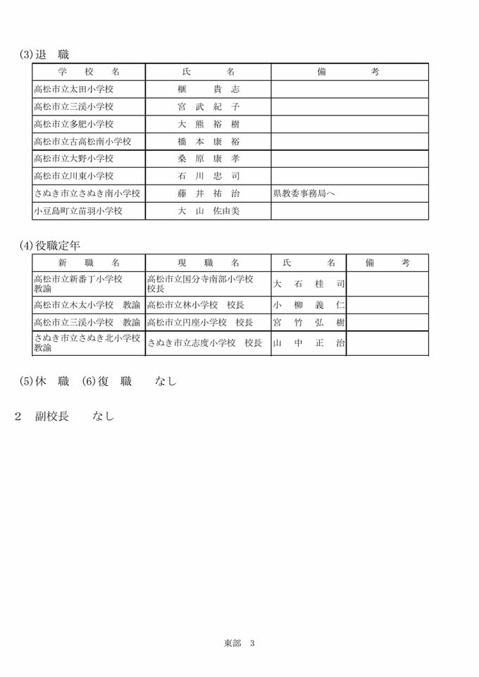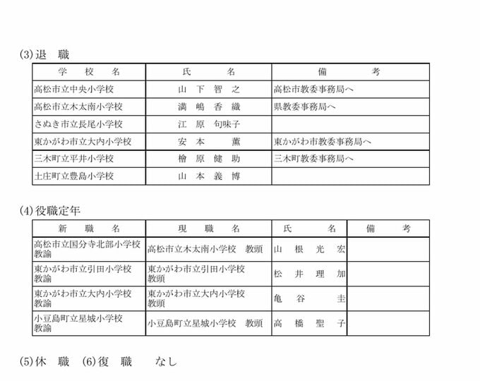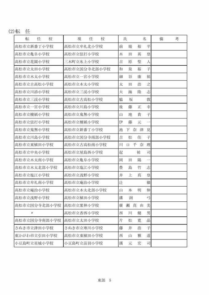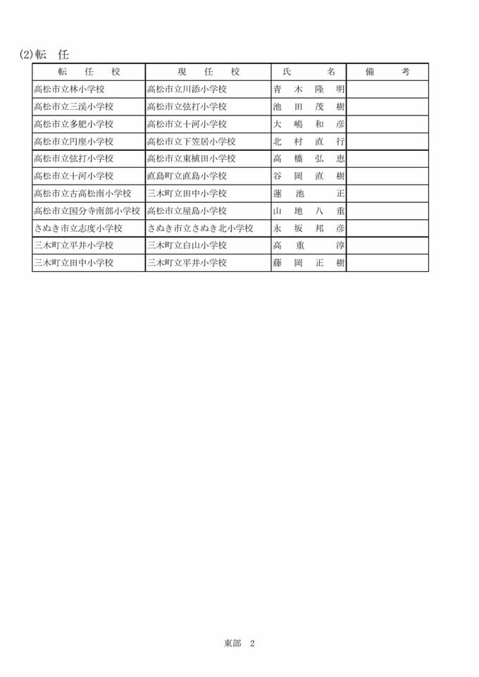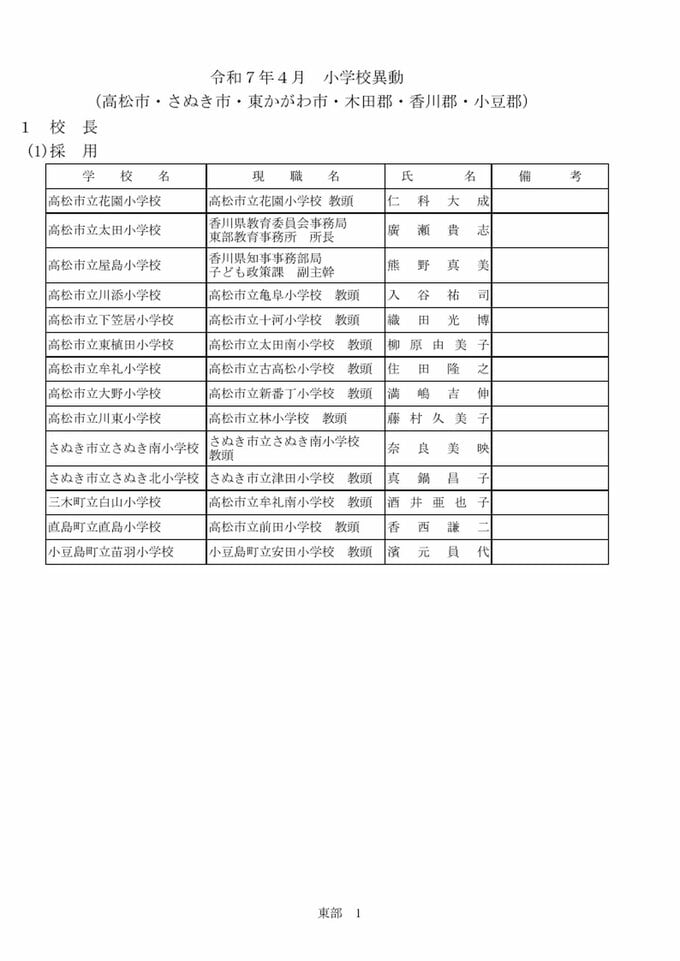 香川県 教職員人事異動2025「あの先生、どこ行ったんかいのぅ」名簿一覧掲載【香川県東部 公立小中学校】 2025年3月21日(金) 16:00 香川 東部(高松市・さぬき市・東かがわ市・木田郡・香川郡・小豆郡)公立小学校 校長・副校長・教頭等 東部の公立小学校の校長・副校長・教頭・主幹教諭・指導教諭は、【1~6】の通りです。 【画像1】 【画像2】 【画像3】 【画像4】 【画像5】 【画像6】