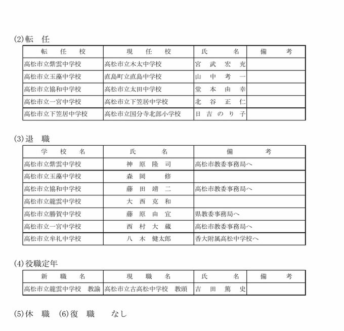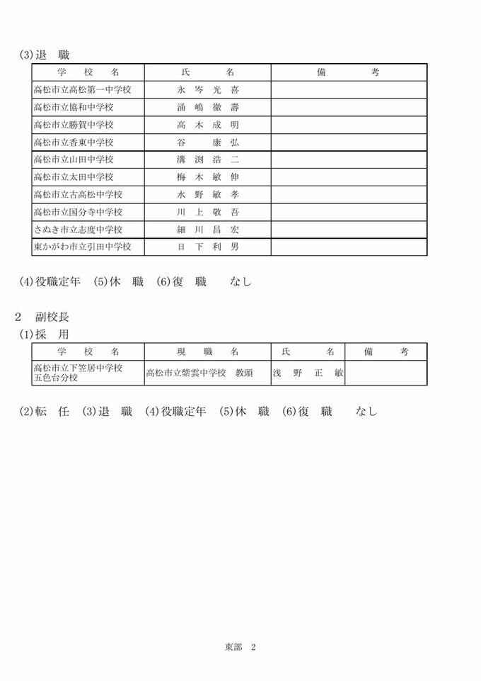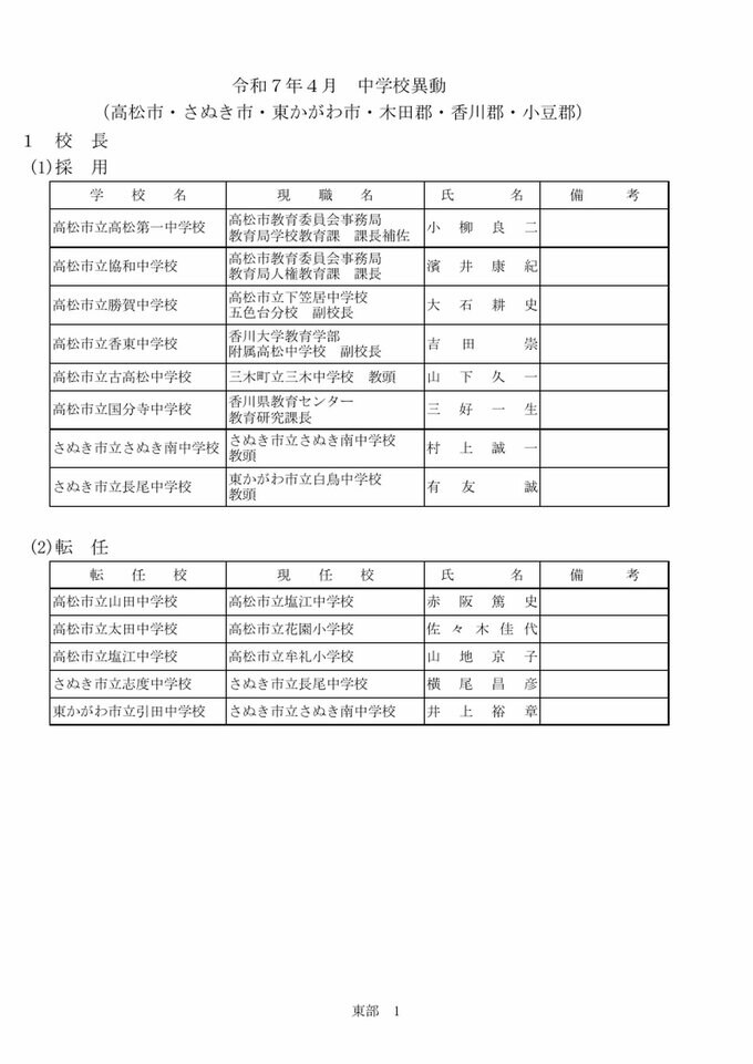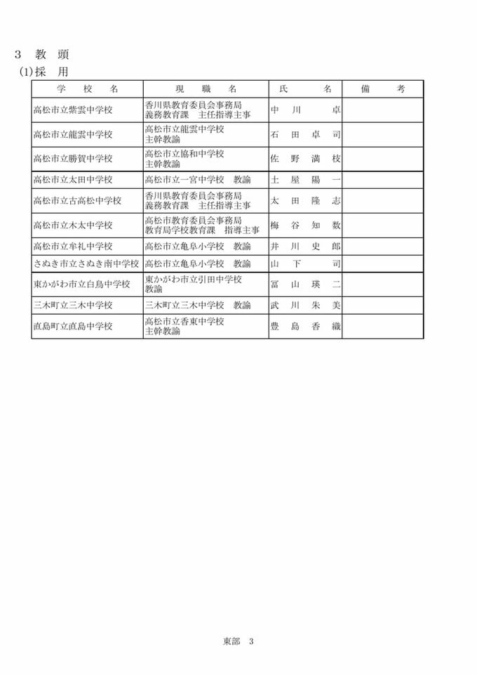 香川県 教職員人事異動2025「あの先生、どこ行ったんかいのぅ」名簿一覧掲載【香川県東部 公立小中学校】 2025年3月21日(金) 16:00 香川 東部(高松市・さぬき市・東かがわ市・木田郡・香川郡・小豆郡)公立中学校 校長・副校長・教頭等 東部の公立中学校の校長・副校長・教頭・主幹教諭・指導教諭は【画像29~32】の通りです。 【画像29】 【画像30】 【画像31】 【画像32】