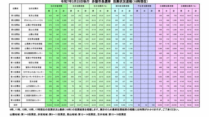 赤磐市長選2025 午後6時現在の投票率は59.09%で前回を上回る【投票状況速報】 2025年3月23日(日) 19:55 岡山 赤磐市選挙管理委員会は、きょう(23日)午後6時現在の赤磐市長選挙の投票状況速報を発表しました。 投票率は59.09%となっていて、前回の57.53%を上回っています。 赤磐市長選挙【投票状況】