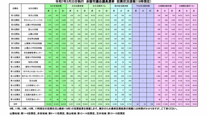 赤磐市議選2025 午後6時現在の投票率は59.08%で前回を上回る【投票状況速報】 2025年3月23日(日) 20:03 岡山 赤磐市選挙管理委員会は、きょう(23日)午後6時現在の赤磐市議会議員選挙の投票状況速報を発表しました。 投票率は、59.08%となっていて、前回の57.52%を上回っています。 赤磐市議選 午後6時現在の投票状況