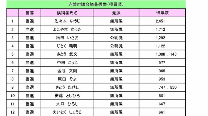 赤磐市議選2025【開票速報】 2025年3月23日(日) 22:49 岡山 赤磐市選挙管理委員会は、きょう(23日)投開票が行われた市議選の開票結果を発表しました。 午後6時現在の赤磐市議会議員選挙の投票率は、59.08%となっていて、前回の57.52%を上回っています。