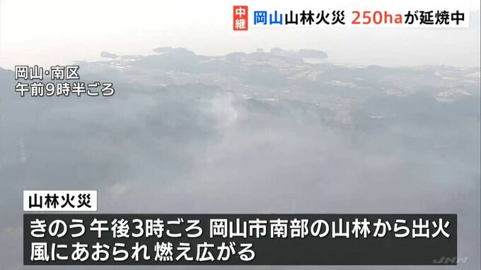 消防によりますと、午前10時現在、岡山市南区、それに玉野市の一部の約250ヘクタールが延焼中です。けが人は今のところ確認されていませんが、これまでに民家と倉庫あわせて6棟が焼けています。