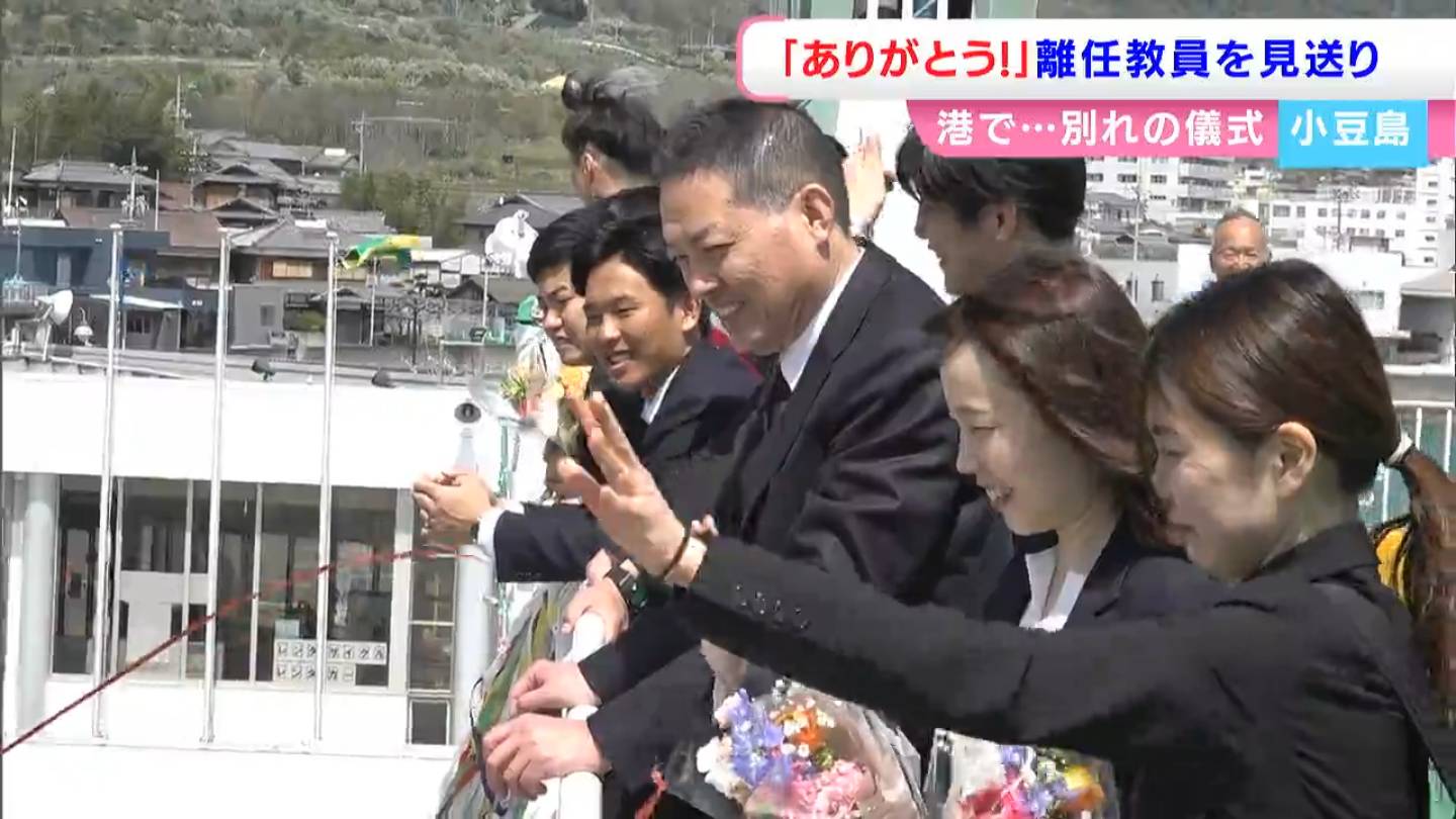 人事異動で島を離れる教員を、生徒たちが港で見送りました。
