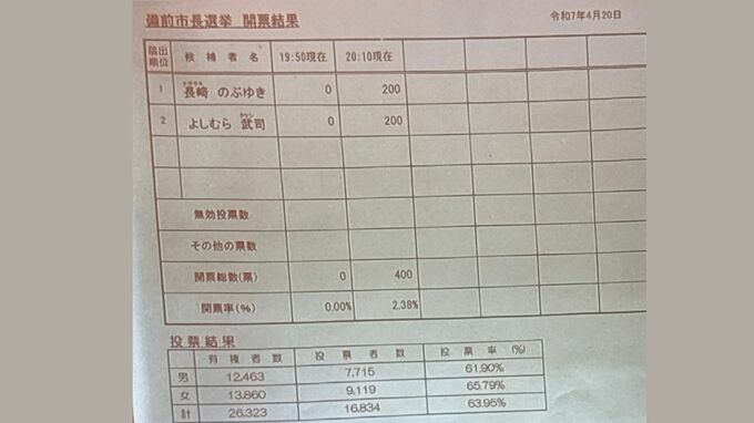 【備前市長選挙2025】午後8時20分の開票速報 2025年4月20日(日) 20:20 岡山 任期満了に伴う備前市長選挙は、きょう(20日)投開票が行われています。 備前市選挙管理委員会によりますと、午後8時20分発表の開票速報は【画像①】の通りです。 【画像①】午後8時20分の開票速報
