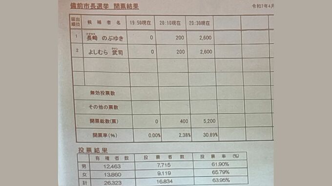 【備前市長選挙2025】午後8時40分の開票速報 2025年4月20日(日) 20:40 岡山 任期満了に伴う備前市長選挙は、きょう(20日)投開票が行われています。 備前市選挙管理委員会によりますと、午後8時40分発表の開票速報は【画像①】の通りです。 【画像①】午後8時40分発表の開票速報