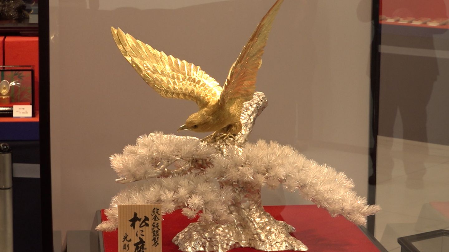まばゆい輝きを放つ純金の胡蝶蘭や、今にも飛び立ちそうな鷹。また、他のものに比べて購入しやすいと人気のストラップや小判など約300点が並びます。きのう(8日)天満屋岡山店で始まった黄金作品展です。