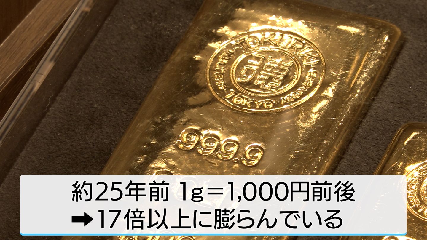 4月には、国内での小売価格が史上初めて1グラム=1万7千円を超え、きのう(8日)も最高値を更新。約25年前には1グラムあたり約1000円だった平均価格が、17倍にも膨らんでいます。今後も価格が上がることが予想される中、安全資産として金を求める人が増えているようです。