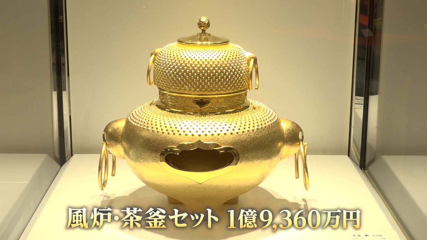 純金のおりんは、約1分もの間、澄んだ音色が続くとして人気です。そして、今回、最も高いものは純金の風炉と茶釜のセット。値段はなんと1憶9千万円を超えます。