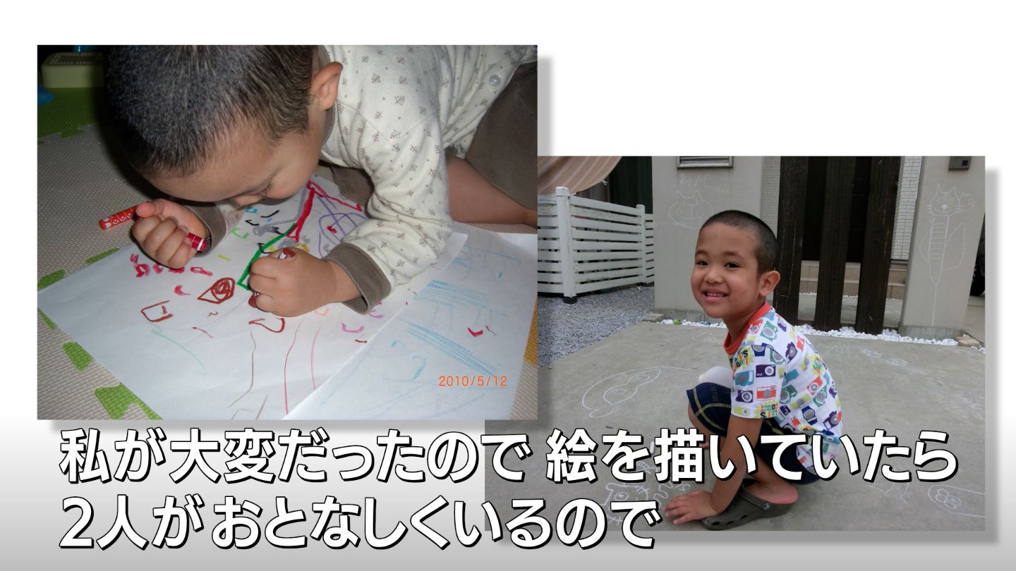 「絵本が大好きで、小さいときから。私が大変だったので、絵を描いていたら2人がおとなしくいるので、その間に用事をするという感じ。ただ私が2人の絵が好きだったというだけで、それをずっと残していただけなので」