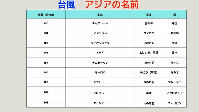 【台風】関東へ向け北上中の台風5号「ナーリー」←何このカタカナ?意味は?台風につく”カタカナ”とは 2025年7月14日(月) 09:53 岡山 100番「ディアンムー」(中国)~140番「サオビエン」(ベトナム) 【画像⑯】にある「メアリー」は英語圏の女性の名前かと思いきや。。。北朝鮮であるものを指す言葉でした。【画像⑱】にある「グチョル」は響きがなんとも...ミクロネシアで、あるものを指す言葉でした。 【画像⑮】 【画像⑯】 【画像⑰】 【画像⑱】 【画像⑲】