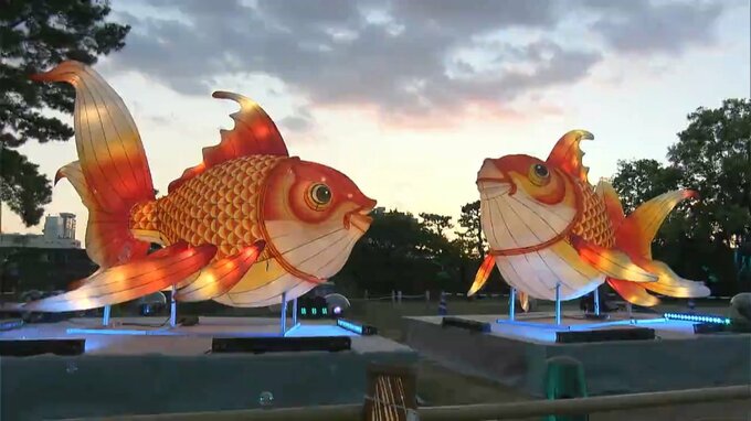 岡山城の”中の段”には大きな金魚のオブジェが登場。あたたかな光と飛び交うシャボン玉で一帯は幻想的な空間に包まれ、訪れた人たちが非日常の風景を写真に収めていました。 「烏城夏まつり」は3日午後9時30分まで岡山城一帯で開催されます。