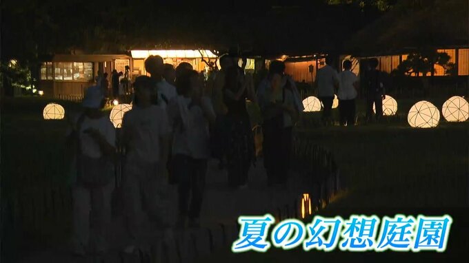 一方、岡山後楽園では、”夏の幻想庭園”が開催されています。園内には柔らかな明かりがともされたおよそ80個の竹製の鞠がちりばめられています。