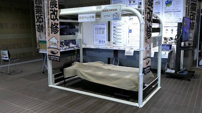 総社市内には1981年以前の「旧耐震基準」で建てられた建築物が多い中、真上から16トンの重さにも耐えられるという「防災ベッド枠」も展示されています。