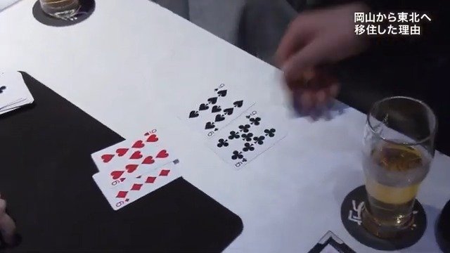 「例えば、9のカードが4つありまして、よかったら手をパーで出してください。はい、OKです。このままでお願いします。(カードを渡して)このマーク、分かりますか?」