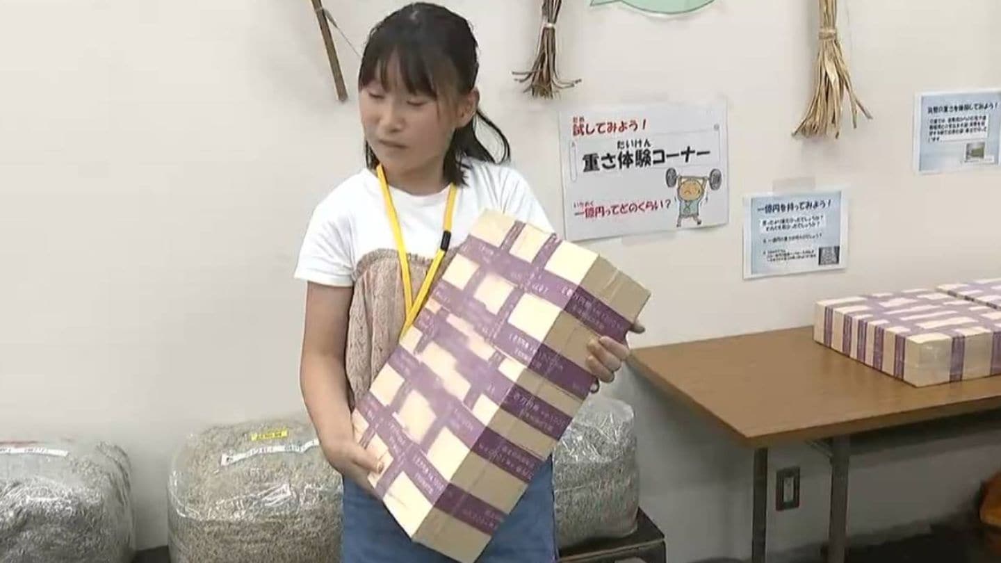 子どもたちが持っているのは1億円を模したパックで重さは10キロです。