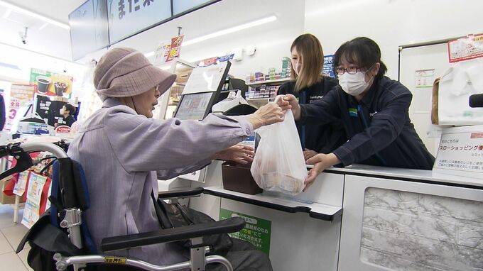 隣にあるグループホームから利用者が買い物に訪れます。ファミリーマート玉野東児店で1時間限定で行われた、高齢者にゆっくりと買い物を楽しんでもらおうという取り組み「スローショッピング」です。