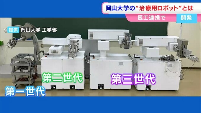 ロボットの開発は2012年に岡山大学の医学部と工学部が協力する「医工連携」で始まりました。2つの学部の教授が13年間、直接何度も顔を合わせてお互いの思いや考え方をすり合わせてきました。当初は工学部だけで作った試作機でスタートしましたが、岡山の民間企業の協力を得て、より完成度の高いロボットへと改良が進みました【画像⑥】。
