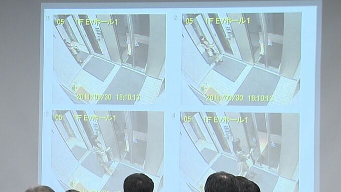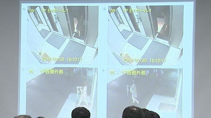 「これ【画像⑤】午後6時10分に退出しようとして、タイムカードを打って外に出ようとしてる姿です。ところが一歩外に出ると、非常にぼやけた形になります【画像⑥】。これをちょっと記憶しておいていただきたいと思って見ていただきました」