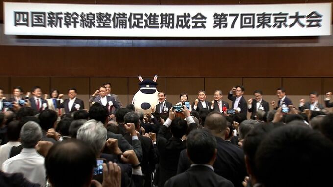 四国への新幹線導入を求め、四国4県の知事や地元選出の国会議員、また、四国新幹線との連結が計画されている岡山市の関係者らが出席した大会で発表されました。