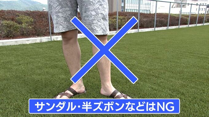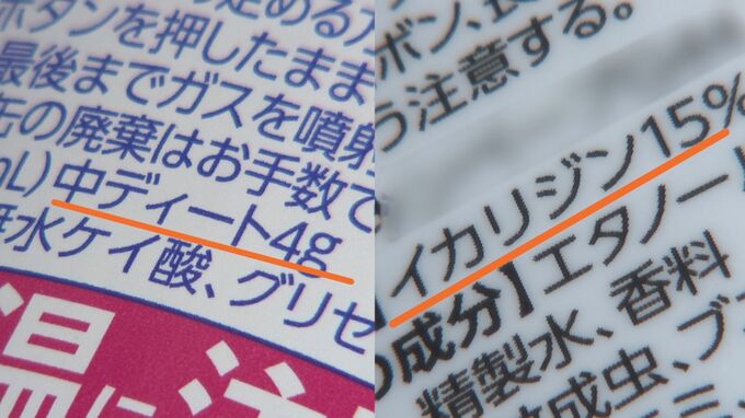 「服装に関しては一番は肌を露出させないこと【画像④】。服のすそや足首を絞ったり、あとは靴下の中に入れること【画像⑤】なども大切になってきます。忌避剤・虫よけスプレーというものは成分を見ていただきたい。ディートという成分、あるいはイカリジン【画像⑥】という成分が入っているものなんかを選んでいただくと、虫よけの性能としてはいいのかなと」