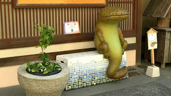 温泉地のシンボルとなっている天然記念物のオオサンショウウオをモチーフにした松岡徹)さんの作品です。第1回の2016年に湯原温泉で作品を展示して以来、地域と深いつながりが生まれたという松岡さん。以来、湯原温泉に足しげく通い、オブジェや足湯などを制作するなど、地域活性化に貢献しています。
