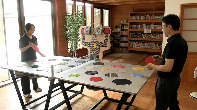 こちら【画像①】は湯原温泉の旅館に展示された体験型アートです。温泉での卓球から着想を得たもので、テーブルに取り付けた鍋の底に球が当たると、心地よい音が響きわたります。