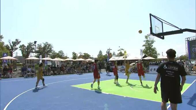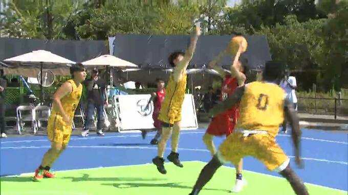 プロバスケットボール選手の馬瓜(まうり)エブリン選手が主催する、3人制バスケットボール大会の予選が倉敷市で開かれ、高校生が熱戦を繰り広げました。
