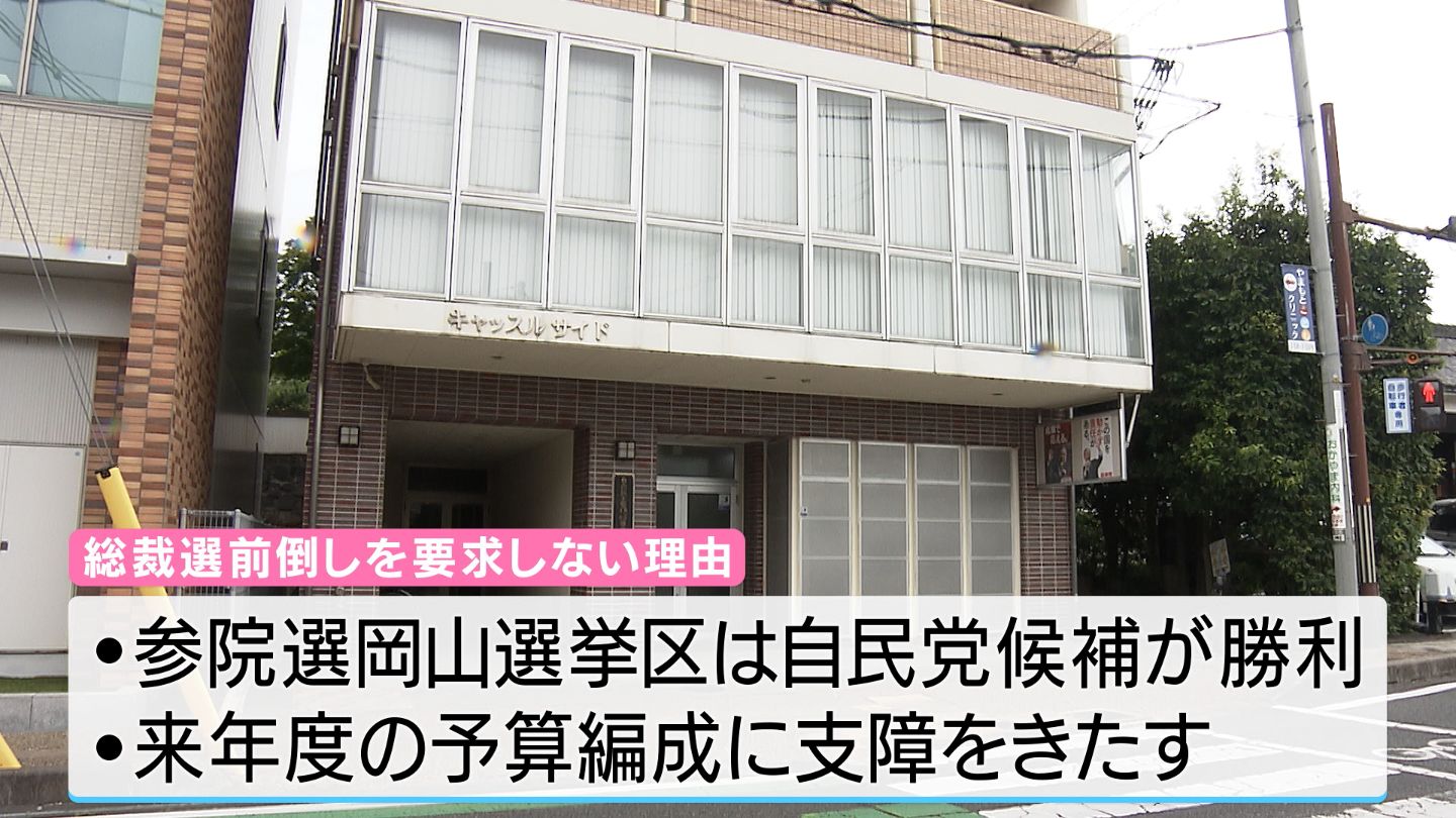 自民党の総裁選の前倒しを巡り、党内からさまざまな声が上がる中、岡山県連は前倒しを要求しないという方針を決めました。自民党の県議25人が参加した総務会で決定しました。