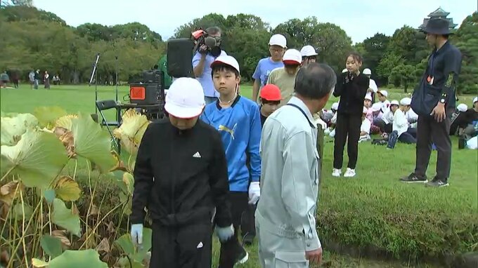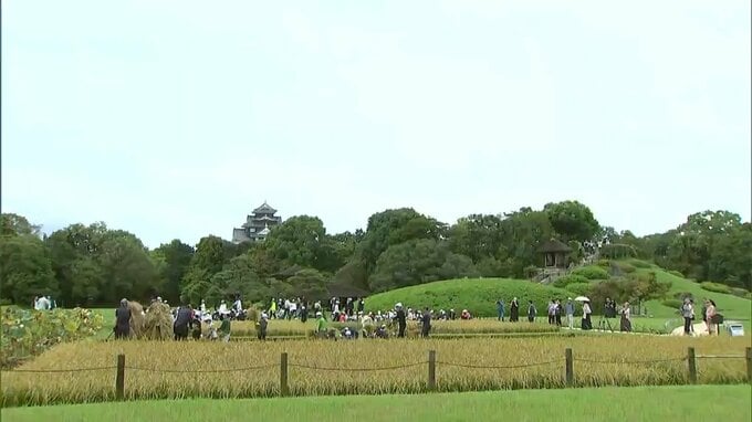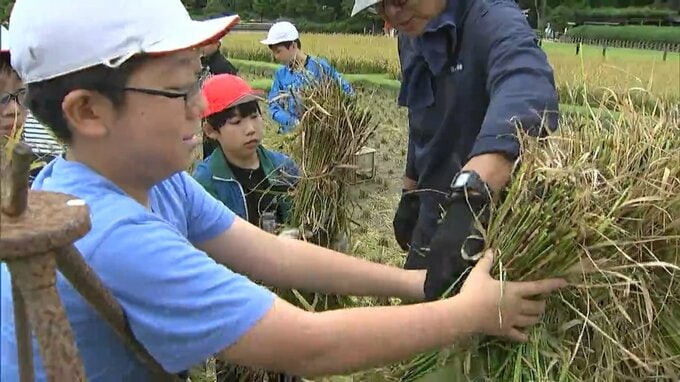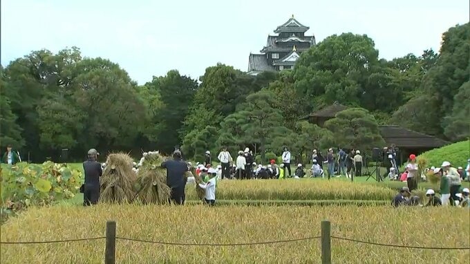 実りの秋です。岡山市北区の岡山後楽園の田んぼで、小学生が稲刈り体験を行いました。