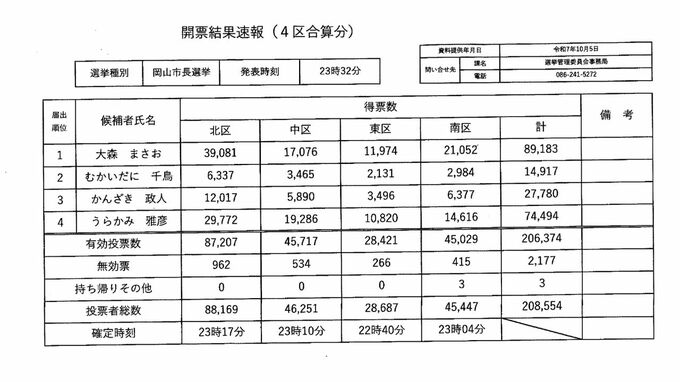 【岡山市長選2025】開票結果 【5日午後11時32分発表】 2025年10月5日(日) 23:50 岡山 任期満了に伴う岡山市長選挙は、きょう(5日)投開票が行われました。 午後11時32分に発表された開票結果は【画像①】の通りです。 【画像①】