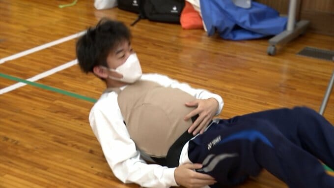 初めは赤ちゃんとの関わり方に戸惑っていた生徒たちも少しずつ慣れ、笑顔もみられました。また、約8キロの重りをつけてペンを拾ったり、起き上がったりする妊婦の体験も。